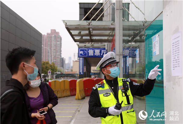4月8日,在武漢宏基長途汽車客運(yùn)站門口,一交警(圖右)正告知2名乘客乘車車次和時(shí)間。(王方 攝)