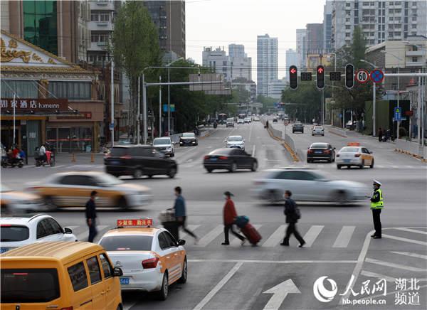 4月8日,在武漢宏基長途汽車客運(yùn)站旁的紅路燈路口,一交警(圖右)正在指揮交通。(王方 攝)