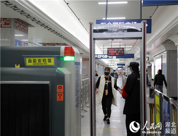 4月8日,在武漢武昌火車站地鐵站安檢區(qū),乘客正有序通過。(王方 攝)