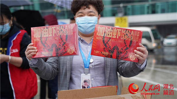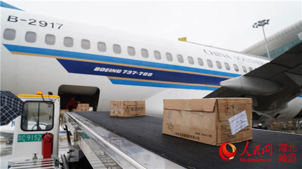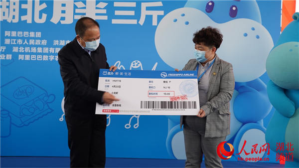 人民網(wǎng)武漢4月20日電 4月20日下午,武漢天河機場,湖北省副省長萬勇給眾多生鮮農(nóng)產(chǎn)品包裝箱“派發(fā)了登機牌”。小龍蝦、藕帶隨盒馬包機出省。