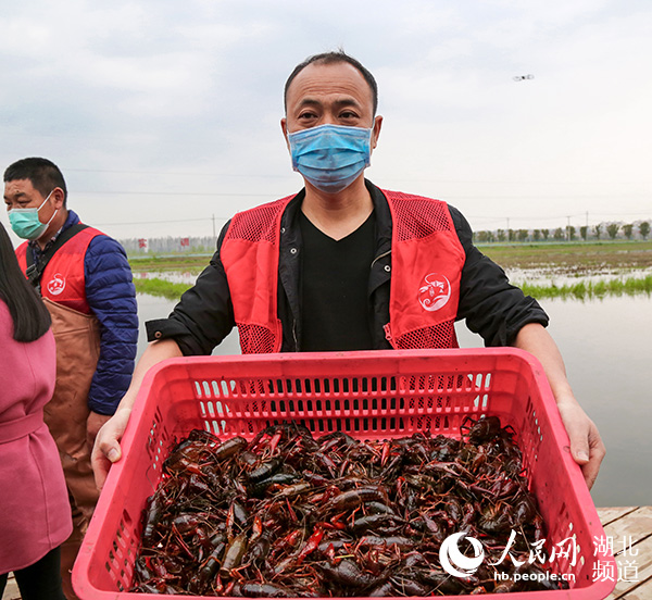 2020年潛江龍蝦開捕儀式上,養(yǎng)殖戶展示龍蝦。(何定科 攝)
