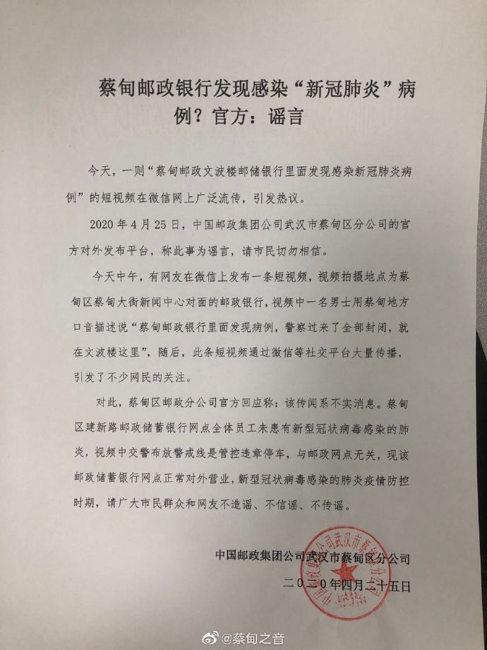 人民網(wǎng)武漢4月26日電 據(jù)武漢市蔡甸區(qū)人民政府官方微博消息,4月25日,一則“蔡甸郵政文波樓郵儲銀行里面發(fā)現(xiàn)感染新冠肺炎病例”的短視頻在微信、網(wǎng)上廣泛流傳,引發(fā)熱議。中國郵政集團公司武漢市蔡甸區(qū)分公司發(fā)布公告稱,此事為謠言,請市民切勿相信。