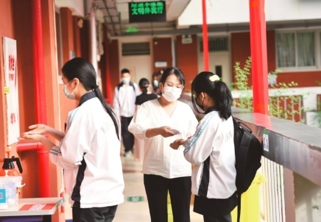 5月20日,武漢7.28萬名初三學(xué)生返校復(fù)課。圖為武漢六中上智中學(xué)初三學(xué)生進(jìn)入教室前給手消毒
