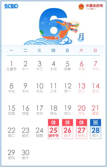 五、端午節(jié):6月25日至27日放假調(diào)休,共3天。6月28日(星期日)上班。