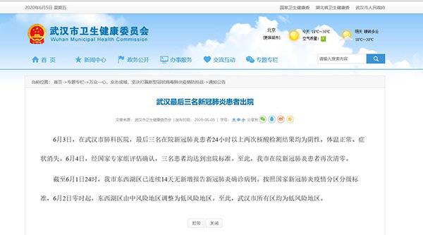 人民網(wǎng)武漢6月5日電 據(jù)武漢市衛(wèi)健委消息,6月3日,在武漢市肺科醫(yī)院,最后三名在院新冠肺炎患者24小時(shí)以上兩次核酸檢測(cè)結(jié)果均為陰性,體溫正常、癥狀消失。6月4日,經(jīng)國(guó)家專家組評(píng)估確認(rèn),三名患者均達(dá)到出院標(biāo)準(zhǔn)。至此,武漢市在院新冠肺炎患者再次清零。