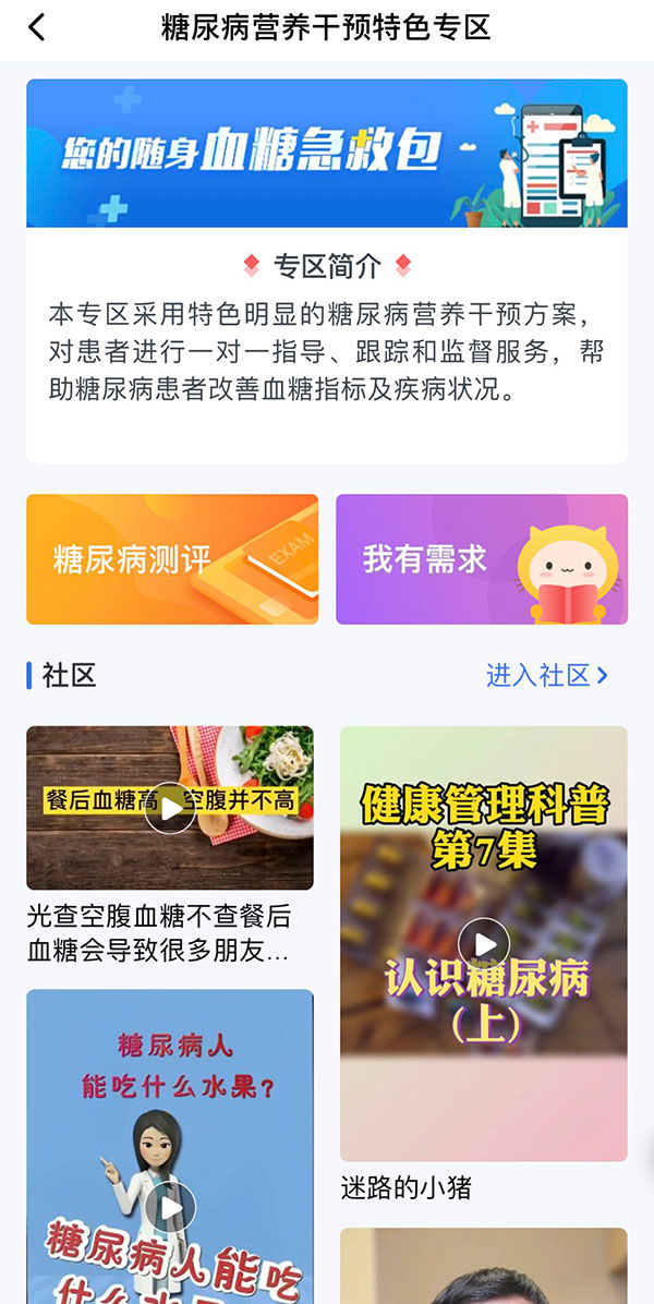 每個專區(qū)均配備特色鮮明的專家、產(chǎn)品、服務(wù)和解決方案,滿足用戶需求。如糖尿病專區(qū),為2型糖尿病患者提供臨床營養(yǎng)專家視頻指導和瑞辰逆糖營養(yǎng)干預(yù)方案,通過線上八周標準管理,可幫助糖尿病患者有效穩(wěn)定血糖,甚至可以實現(xiàn)“日常血糖指數(shù)異常向正常的逆轉(zhuǎn)”。
