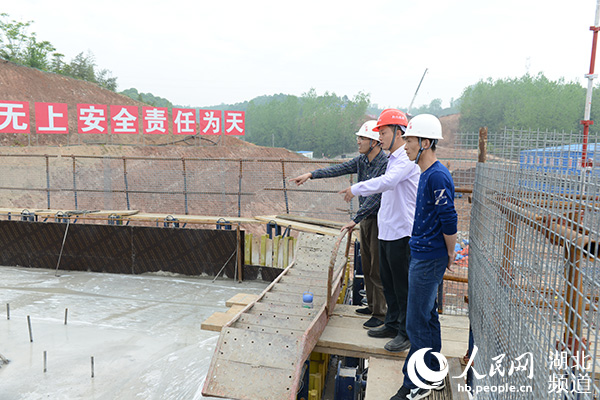 安全管理部部長盧勇在工地現(xiàn)場(左一)