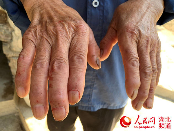 萬(wàn)其珍雙手布滿滄桑。趙瞳 攝