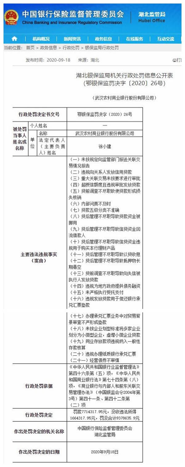 人民網(wǎng)武漢9月20日電 9月18日,湖北銀保監(jiān)局公布的行政處罰信息公開(kāi)表顯示,武漢農(nóng)村商業(yè)銀行股份有限公司因未按規(guī)定向監(jiān)管部門(mén)報(bào)送關(guān)聯(lián)交易情況報(bào)告、違規(guī)向關(guān)系人發(fā)放信用貸款等二十一項(xiàng)違法違規(guī)行為,被罰款771.43萬(wàn)元,沒(méi)收違法所得166.43萬(wàn)元,罰沒(méi)合計(jì)937.86萬(wàn)元。