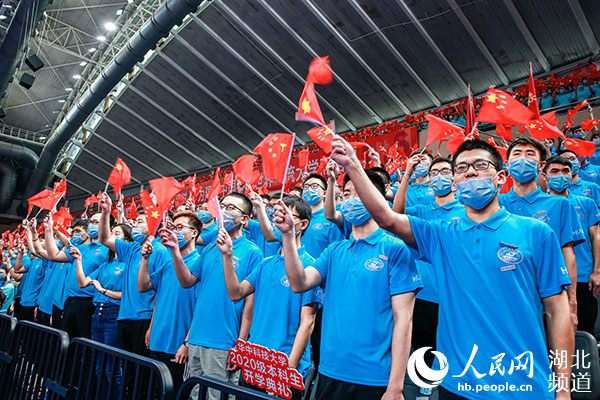 “五星紅旗迎風飄揚,勝利歌聲多么響亮;歌唱我們親愛的祖國,從今走向繁榮富強……”開學典禮最后,該校光谷體育館響起了響亮的歌聲,全體師生齊唱《歌唱祖國》,他們搖動著手中的五星紅旗,慶祝著人生的新起點。(周雯 王瀟瀟 高翔)