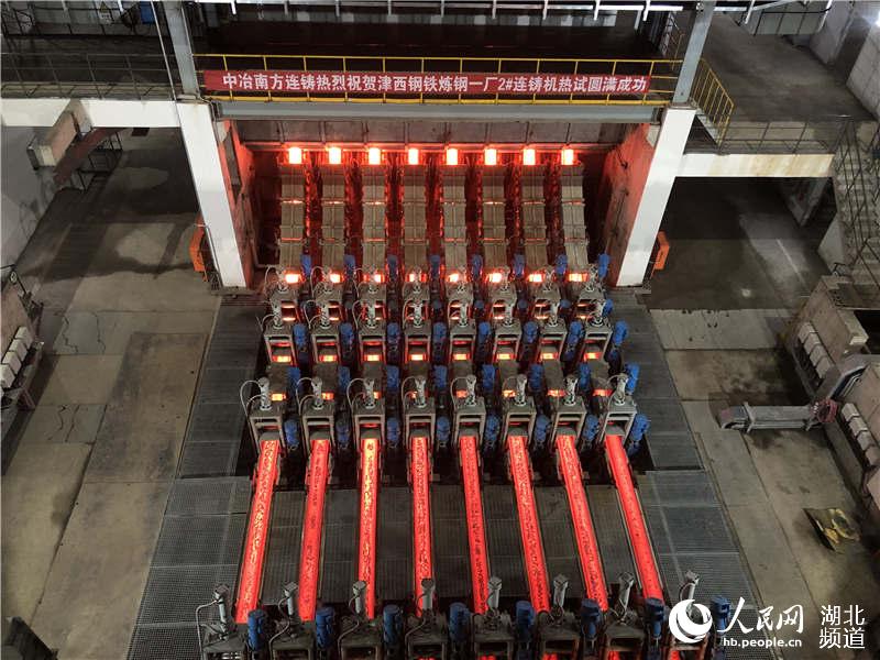 津西鋼鐵2#鑄機(jī)項(xiàng)目現(xiàn)場(chǎng),紅紅的鋼水經(jīng)過連鑄機(jī)魔術(shù)般的變化,變成一根根鋼坯出爐。