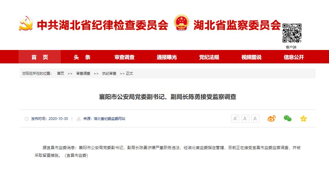 人民網(wǎng)武漢10月30日電 據(jù)湖北省紀(jì)委監(jiān)委官網(wǎng)消息,襄陽(yáng)市公安局黨委副書(shū)記、副局長(zhǎng)陳勇涉嫌嚴(yán)重職務(wù)違法,經(jīng)湖北省監(jiān)委指定管轄,目前正在接受宜昌市監(jiān)委監(jiān)察調(diào)查,并被采取留置措施。