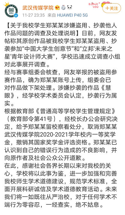 根據(jù)教育部《普通高等學(xué)校學(xué)生管理規(guī)定》(教育部令第41號(hào)),經(jīng)該校長(zhǎng)辦公會(huì)研究決定,給予鄭某某留校察看處分,取消鄭某某武漢傳媒學(xué)院2020-2021學(xué)年校內(nèi)一等獎(jiǎng)學(xué)金,撤銷(xiāo)其國(guó)家獎(jiǎng)學(xué)金評(píng)選資格。鄭某某已認(rèn)識(shí)到自己的錯(cuò)誤行為造成的不良影響,并向原作者及社會(huì)公眾公開(kāi)道歉。