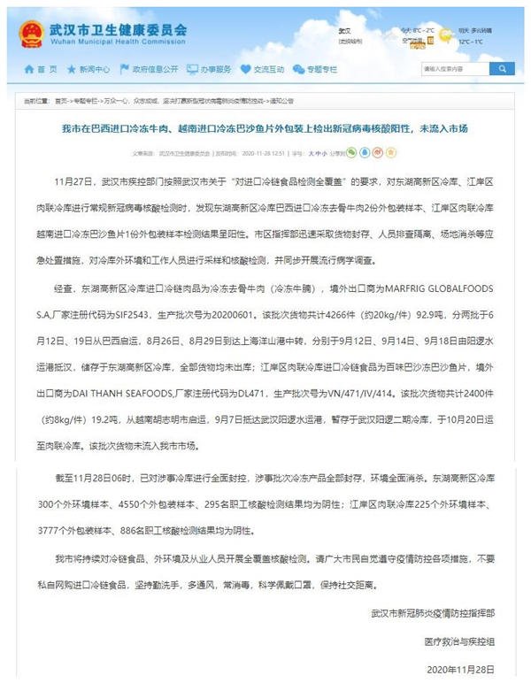人民網(wǎng)武漢11月28日電 今日,武漢市新冠肺炎疫情防控指揮部醫(yī)療救治與疾控組發(fā)布公告稱, 11月27日,武漢市疾控部門按照武漢市關(guān)于“對(duì)進(jìn)口冷鏈?zhǔn)称窓z測(cè)全覆蓋”的要求,對(duì)東湖高新區(qū)冷庫(kù)、江岸區(qū)肉聯(lián)冷庫(kù)進(jìn)行常規(guī)新冠病毒核酸檢測(cè)時(shí),發(fā)現(xiàn)東湖高新區(qū)冷庫(kù)巴西進(jìn)口冷凍去骨牛肉2份外包裝樣本、江岸區(qū)肉聯(lián)冷庫(kù)越南進(jìn)口冷凍巴沙魚片1份外包裝樣本檢測(cè)結(jié)果呈陽(yáng)性。