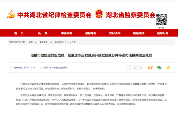 人民網(wǎng)武漢12月14日電 湖北省紀(jì)委監(jiān)委12月14日通報(bào),仙桃市政協(xié)原黨組成員、副主席陳啟發(fā)受到開除黨籍處分并移送司法機(jī)關(guān)依法處理。