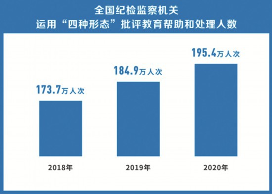 “年報(bào)”顯示,2020年全國紀(jì)檢監(jiān)察機(jī)關(guān)運(yùn)用“四種形態(tài)”批評(píng)教育幫助和處理共195.4萬人次。在2018年173.7萬人次、2019年184.9萬人次基礎(chǔ)上,總?cè)舜卧賱?chuàng)新高。