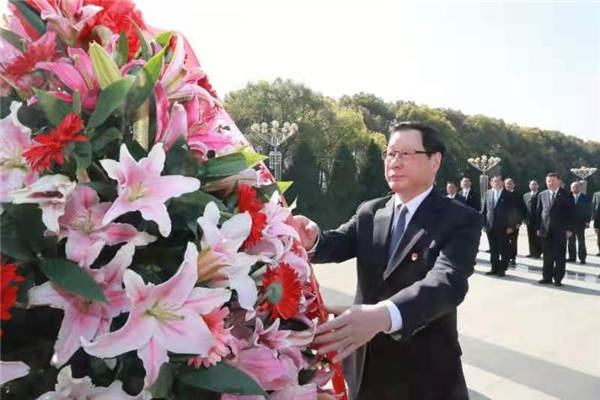 湖北省委書(shū)記應(yīng)勇為紀(jì)念碑前的花籃整理緞帶。陳?ài)E攝