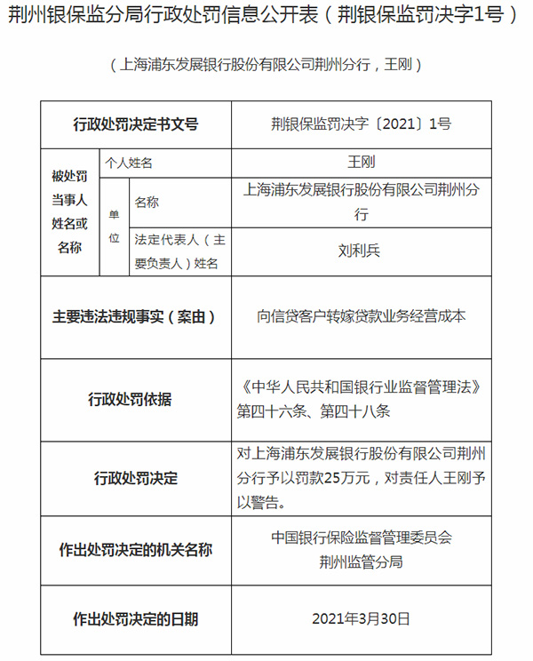 根據(jù)公告,上海浦東發(fā)展銀行荊州分行因向信貸客戶轉(zhuǎn)嫁貸款業(yè)務(wù)經(jīng)營成本的違法違規(guī)行為,依據(jù)《中華人民共和國銀行業(yè)監(jiān)督管理法》第四十六條、第四十八條,荊州銀保監(jiān)分局對上海浦東發(fā)展銀行股份有限公司荊州分行予以罰款25萬元,對責(zé)任人王剛予以警告。行政處罰決定書文號為:荊銀保監(jiān)罰決字〔2021〕1號。(冀東)
