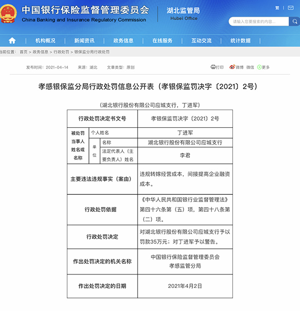 根據(jù)公告,湖北銀行股份有限公司應城支行因違規(guī)轉嫁經營成本,間接提高企業(yè)融資成本的違法違規(guī)行為,依據(jù)《中華人民共和國銀行業(yè)監(jiān)督管理法》第四十六條第(五)項,第四十八條第(二)項,孝感銀保監(jiān)分局對湖北銀行股份有限公司應城支行予以罰款35萬元,對當事人丁進軍予以警告。行政處罰決定書文號為:孝銀保監(jiān)罰決字〔2021〕2號。(冀東)