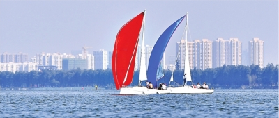 2020年10月1日,在東湖帆船基地,“2020年全國槳板錦標賽”參賽選手在廣闊的東湖湖面上你追我趕,成為一道亮麗的風景。