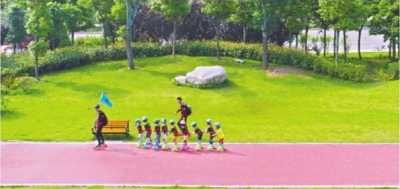 武漢沿江江灘改造升級后,江灘已成為一道亮麗的城市風景線。圖為孩子們在青山江灘綠道上練習輪滑。