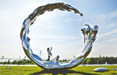 2020年5月22日,在漢口江灘四期園區(qū),游客與雕塑《長江之約》“合影”。