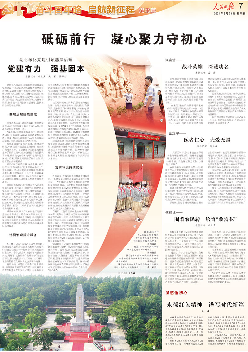 回顧黨的百年奮斗歷程,湖北的發(fā)展與黨的命運(yùn)緊緊相連,從大別山革命根據(jù)地,到地處秦巴山區(qū)的深度貧困村,從“誓與大堤共存亡”的錚錚誓言,到舍生忘死的最美逆行,湖北英雄輩出:董必武、陳潭秋、張富清、張定宇……每一位英雄,都在荊楚大地上賡續(xù)著偉大的紅色精神。
