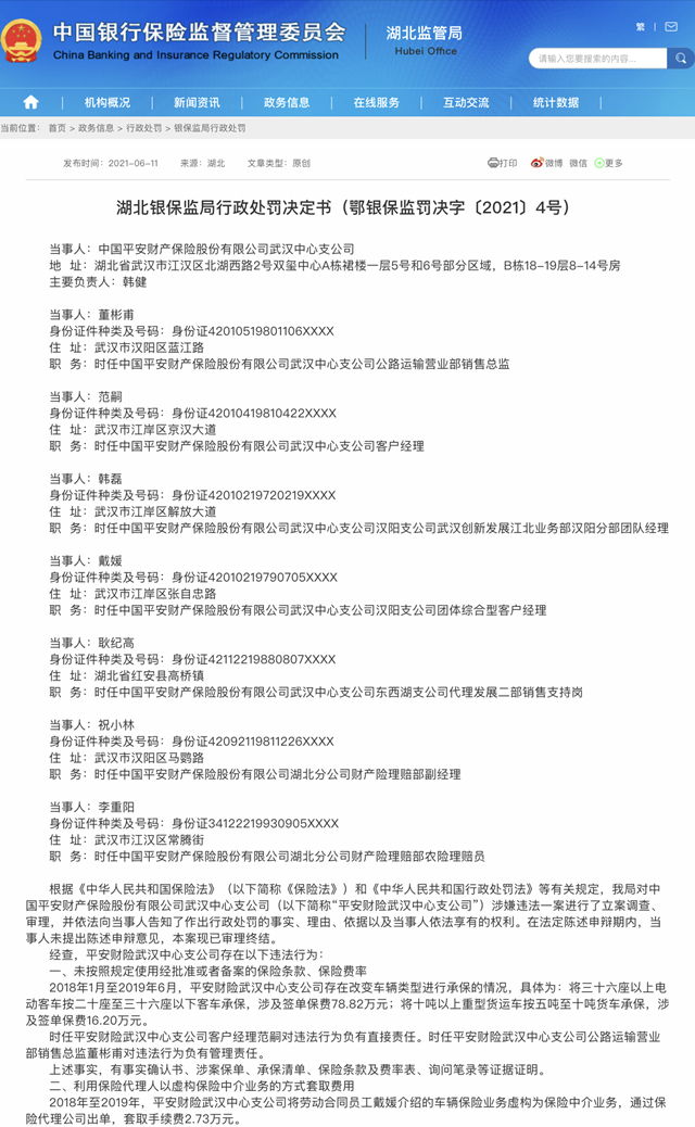 近日,湖北銀保監(jiān)局行政處罰決定書(鄂銀保監(jiān)罰決字〔2021〕4號(hào))顯示:經(jīng)查,平安財(cái)產(chǎn)保險(xiǎn)股份有限公司武漢中心支公司存在四項(xiàng)違法行為,依規(guī)被予以警告并罰款54萬元。