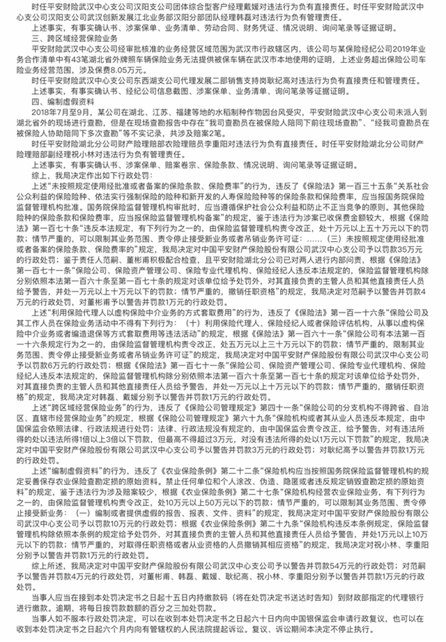 時(shí)任平安財(cái)險(xiǎn)湖北分公司財(cái)產(chǎn)險(xiǎn)理賠部農(nóng)險(xiǎn)理賠員李重陽(yáng)對(duì)違法行為負(fù)有直接責(zé)任。時(shí)任平安財(cái)險(xiǎn)湖北分公司財(cái)產(chǎn)險(xiǎn)理賠部副經(jīng)理祝小林對(duì)違法行為負(fù)有管理責(zé)任。