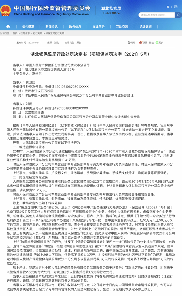 近日,湖北銀保監(jiān)局行政處罰決定書(鄂銀保監(jiān)罰決字〔2021〕5號)顯示,中國人民財產(chǎn)保險股份有限公司武漢市分公司因編造虛假中介業(yè)務、及跨區(qū)域經(jīng)營保險業(yè)務被予以警告并罰款16萬元,對劉暢予以警告并罰款2萬元的行政處罰,對黃衛(wèi)紅予以警告并罰款1萬元的行政處罰。