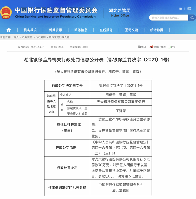日前,湖北銀保監(jiān)局機(jī)關(guān)行政處罰信息公開(kāi)表(鄂銀保監(jiān)罰決字〔2021〕1號(hào))公開(kāi)顯示,光大銀行股份有限公司襄陽(yáng)分行存在貸款三查不盡職導(dǎo)致信貸資金被挪用、辦理貿(mào)易背景不清的銀行承兌匯票業(yè)務(wù)等違法違規(guī)事實(shí)。中國(guó)銀保監(jiān)會(huì)湖北監(jiān)管局依法依規(guī),對(duì)光大銀行股份有限公司襄陽(yáng)分行予以罰款70萬(wàn)元;對(duì)責(zé)任人胡俊奇予以禁止終身從事銀行業(yè)工作;對(duì)董斌予以警告、罰款5萬(wàn)元;對(duì)黃毅予以警告。(冀東)