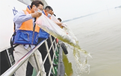 江夏區(qū)紀(jì)委、區(qū)人民法院、區(qū)檢察院、漁政部門在長(zhǎng)江江夏段流域放流成魚(yú)。