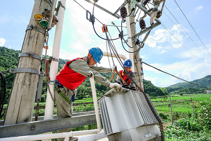 在黃岡英山縣,共產黨員服務隊隊員正在為薛家畈村3#臺區(qū)更換變壓器,確保居民清涼度夏。豐俊攝