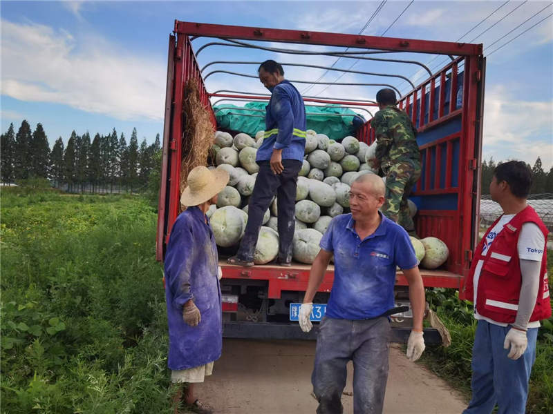 “10分鐘前,3萬斤剛從地里采摘的冬瓜,運(yùn)往了河南周口!7月22日晚7時左右,從湖北省武漢市東西湖辛安渡街三合大隊出發(fā)的兩輛貨車,滿載冬瓜,開赴周口商水縣的部分社區(qū),那里也是此次河南暴雨受災(zāi)較嚴(yán)重的區(qū)域。