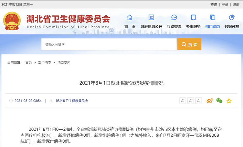 人民網(wǎng)武漢8月2日電 據(jù)湖北省衛(wèi)健委消息,2021年8月1日0—24時,全省新增新冠肺炎確診病例2例(均為荊州市沙市區(qū)本土確診病例,均已轉(zhuǎn)至定點醫(yī)療機構(gòu)救治),新增疑似病例0例,新增出院病例1例(為境外輸入,來自7月2日阿富汗—武漢MF8008航班),新增死亡病例0例。