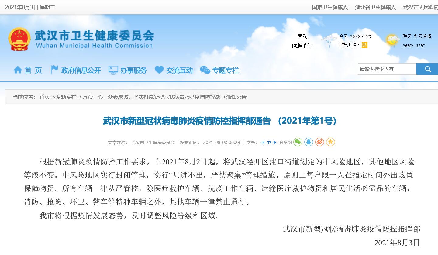 根據(jù)新冠肺炎疫情防控工作要求,自2021年8月2日起,將武漢經(jīng)開區(qū)沌口街道劃定為中風險地區(qū),其他地區(qū)風險等級不變。中風險地區(qū)實行封閉管理,實行“只進不出,嚴禁聚集”管理措施。原則上每戶限一人在指定時間外出購置保障物資。所有車輛一律從嚴管控,除醫(yī)療救護車輛、抗疫工作車輛、運輸醫(yī)療救護物資和居民生活必需品的車輛,消防、搶險、環(huán)衛(wèi)、警車等特種車輛之外,其他車輛一律禁止通行。
