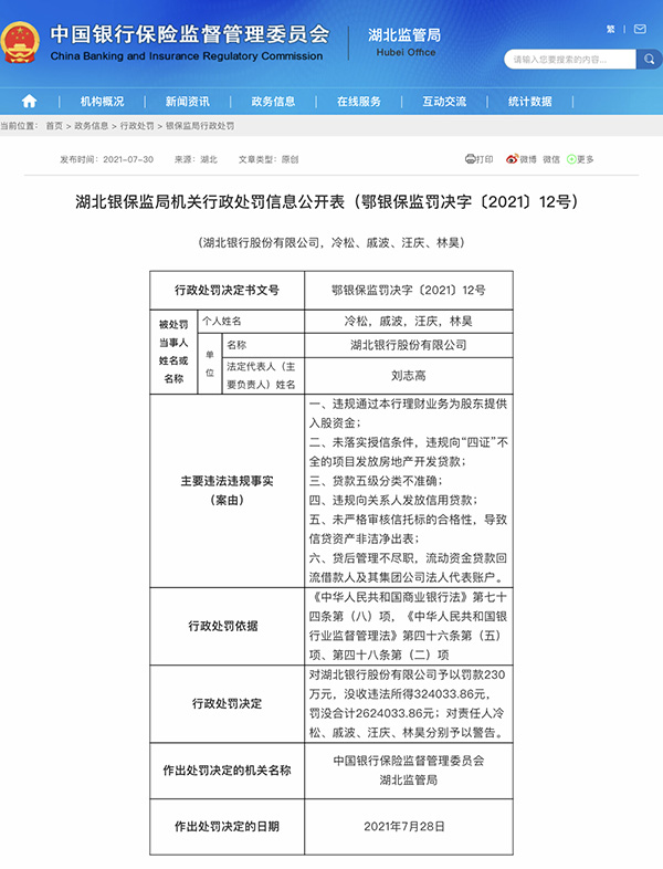 人民網(wǎng)武漢8月4日電 日前,湖北銀保監(jiān)局機(jī)關(guān)行政處罰信息公開表(鄂銀保監(jiān)罰決字〔2021〕12號)公開顯示,湖北銀行股份有限公司存在違規(guī)通過本行理財業(yè)務(wù)為股東提供入股資金;未落實(shí)授信條件,違規(guī)向“四證”不全的項(xiàng)目發(fā)放房地產(chǎn)開發(fā)貸款;貸款五級分類不準(zhǔn)確;違規(guī)向關(guān)系人發(fā)放信用貸款;未嚴(yán)格審核信托標(biāo)的合格性,導(dǎo)致信貸資產(chǎn)非潔凈出表;貸后管理不盡職,流動資金貸款回流借款人及其集團(tuán)公司法人代表賬戶六大違法違規(guī)事實(shí)。該分行的法定代表人(主要負(fù)責(zé)人)為劉志高。中國銀保監(jiān)會湖北監(jiān)管局依法依規(guī),對湖北銀行股份有限公司予以罰款230萬元,沒收違法所得324033.86元,罰沒合計2624033.86元;對責(zé)任人冷松、戚波、汪慶、林昊分別予以警告。(徐弦子)