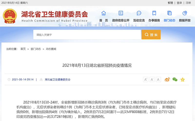 人民網(wǎng)武漢8月14日電 據(jù)湖北衛(wèi)健委消息,2021年8月13日0-24時(shí),全省新增新冠肺炎確診病例3例(均為荊門市本土確診病例,均已轉(zhuǎn)至定點(diǎn)醫(yī)療機(jī)構(gòu)救治),無(wú)癥狀感染者轉(zhuǎn)確診1例(為荊門市本土無(wú)癥狀感染者,已轉(zhuǎn)至定點(diǎn)醫(yī)療機(jī)構(gòu)救治),新增疑似病例0例,新增出院病例4例(均為境外輸入,2例來(lái)自7月2日阿富汗—武漢MF8008航班,2例來(lái)自7月12日印度尼西亞雅加達(dá)—武漢JT2619航班),新增死亡病例0例。