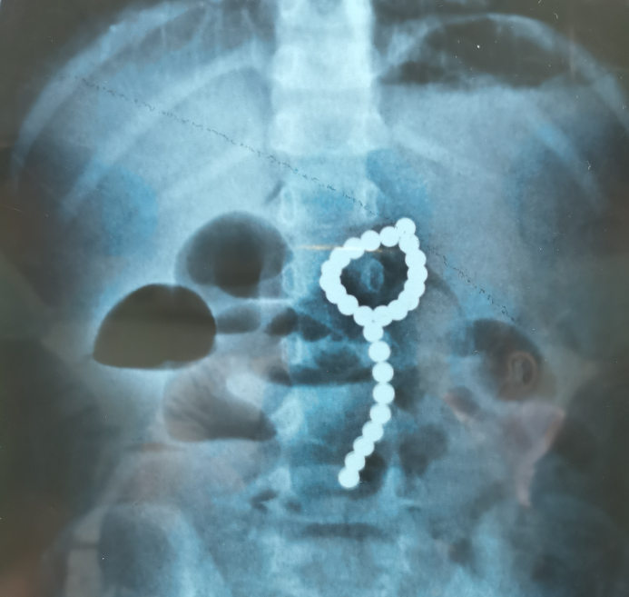 4歲女孩莎莎(化名)平時(shí)健康活潑,家住鄂南地區(qū)。8月11日晚上,她吃晚飯后總說(shuō)“肚子痛”,疼得厲害時(shí)大汗淋漓,還吐了幾次。家長(zhǎng)擔(dān)心是吃壞了肚子,就莎莎帶到當(dāng)?shù)蒯t(yī)院就診。拍片發(fā)現(xiàn),莎莎腹部有異常高密度陰影,看形狀像是一顆一顆的小珠子,一數(shù)有26顆。在父母的追問(wèn)下,莎莎才說(shuō)她吞了“彩色的小珠珠”,推測(cè)應(yīng)該是家里的玩具磁力珠。