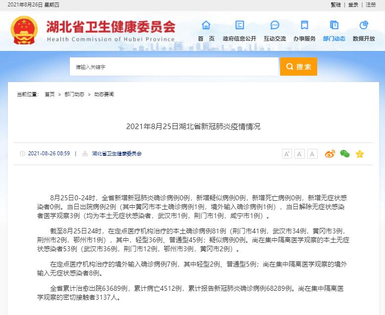 截至8月25日24時,在定點醫(yī)療機構治療的本土確診病例81例(荊門市41例,武漢市34例,黃岡市3例,荊州市2例,鄂州市1例),其中,輕型36例、普通型45例;疑似病例0例。尚在集中隔離醫(yī)學觀察的本土無癥狀感染者53例(武漢市36例,荊門市12例,鄂州市3例,黃岡市2例)。