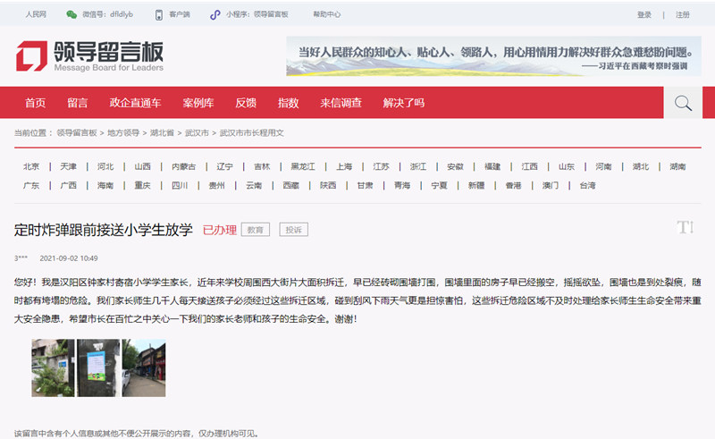 該網(wǎng)友介紹,近年來該學校周圍漢陽區(qū)西大街片區(qū)大面積拆遷,早已經(jīng)磚砌圍墻打圍,圍墻里面的房子早已經(jīng)搬空,搖搖欲墜,圍墻也是到處裂痕!跋M虚L在百忙之中關心一下我們的家長老師和孩子的生命安全。”該網(wǎng)友在給武漢市市長程用文留言稱。