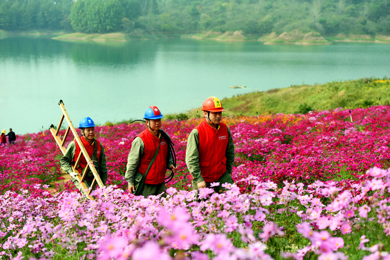 國網(wǎng)老河口市供電公司仙人渡供電所員工在登云湖景區(qū)內(nèi)巡視電力線路。郭峰攝