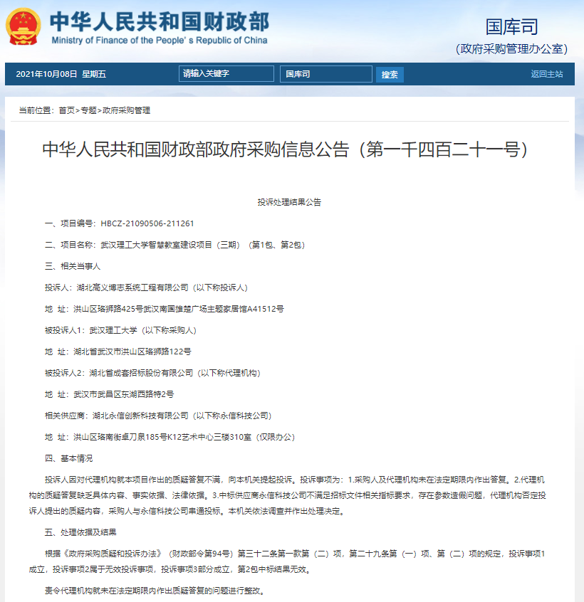 人民網(wǎng)武漢10月9日電 9月29日,財(cái)政部發(fā)布《中華人民共和國財(cái)政部政府采購信息公告(第一千四百二十一號(hào))》,對(duì)武漢理工大學(xué)智慧教室建設(shè)項(xiàng)目(三期)(第1包、第2包)被投訴事項(xiàng)做出公開答復(fù),認(rèn)定該項(xiàng)目第2包中標(biāo)結(jié)果無效,并責(zé)令代理機(jī)構(gòu)就未在法定期限內(nèi)作出質(zhì)疑答復(fù)的問題進(jìn)行整改。