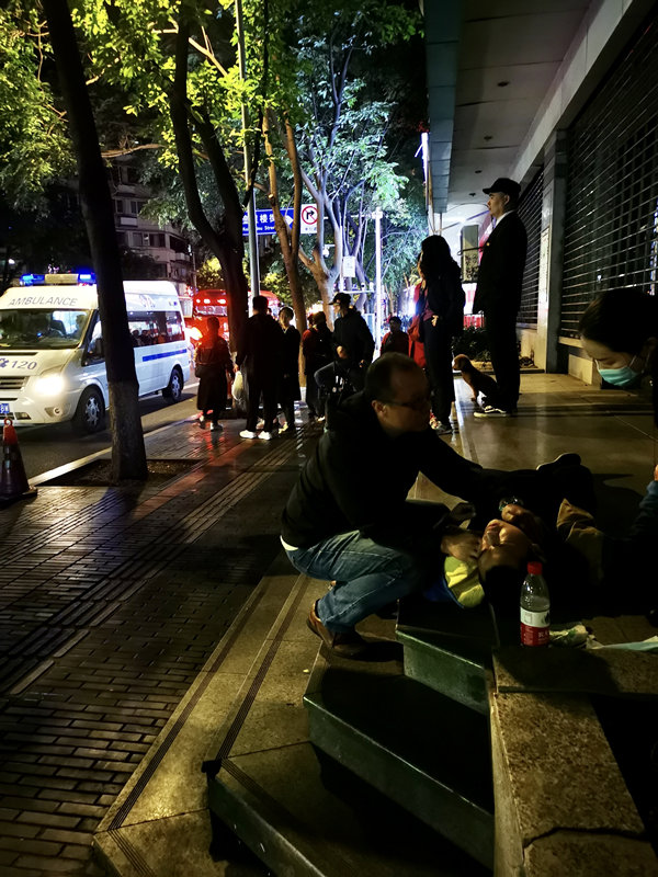 成都街頭下著毛毛雨,氣溫驟降至15°以下,陳明鍇顧不得下雨淋濕的路面,雙膝跪在雨中在患者身邊施救。