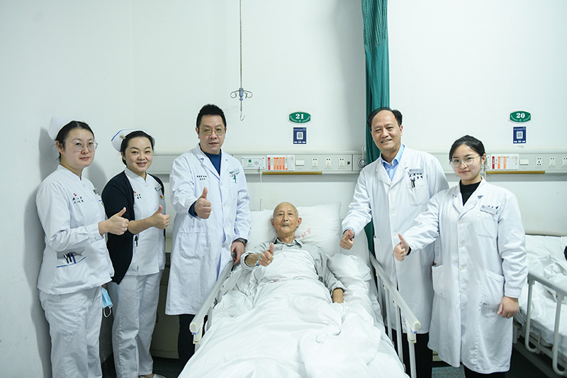 蔣遵海老人與救治他的骨II科醫(yī)護(hù)團(tuán)隊(duì)合影。劉瑜攝