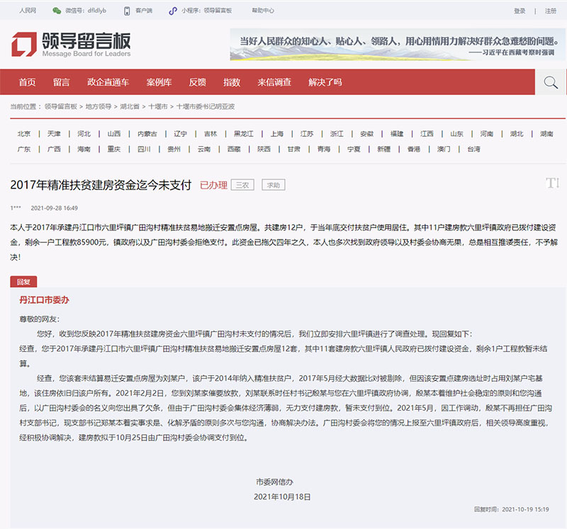 10月19日,丹江口市委網(wǎng)信辦回復(fù),收到反映問題后,立即安排六里坪鎮(zhèn)進(jìn)行了調(diào)查處理。剩余1戶工程款暫未結(jié)算,情況屬實(shí)。