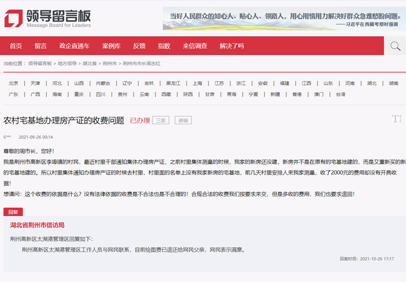 10月26日,湖北省荊州市信訪局在人民網(wǎng)“領(lǐng)導(dǎo)留言板”上回復(fù)稱,荊州高新區(qū)太湖港管理區(qū)工作人員與網(wǎng)民聯(lián)系,目前繪圖費(fèi)已退還給網(wǎng)民父親,網(wǎng)民表示滿意。