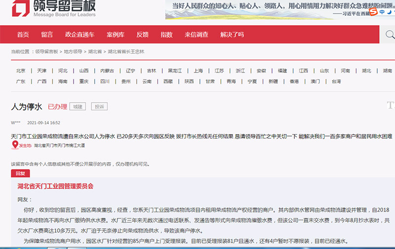 10月14日,天門(mén)工業(yè)園管理委員會(huì)回復(fù)稱(chēng),收到留言后,園區(qū)高度重視,經(jīng)查,天門(mén)工業(yè)園榮成物流項(xiàng)目?jī)?nèi)部供水管網(wǎng)由榮成物流自己建設(shè)并管理。自2018年起,榮成物流不再向水廠繳納供水水費(fèi)。水廠近三年來(lái)無(wú)數(shù)次通過(guò)電話聯(lián)系、發(fā)通告等形式向榮成物流催繳水費(fèi),但該公司一直未交水費(fèi)。到今年8月抄水表時(shí),已欠水廠水費(fèi)高達(dá)10多萬(wàn)元。水廠迫于無(wú)奈停止向榮成物流供水,導(dǎo)致商戶(hù)停水。