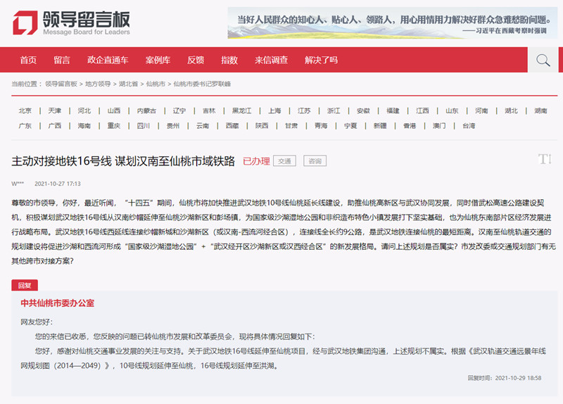 “仙桃應(yīng)主動(dòng)對(duì)接地鐵16號(hào)線,謀劃漢南至仙桃市域鐵路!10月27日,湖北仙桃一網(wǎng)友在人民網(wǎng)“領(lǐng)導(dǎo)留言板”上留言建議。