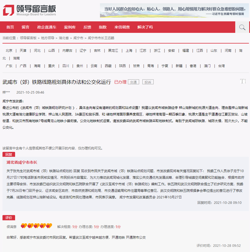 對(duì)于回復(fù),該網(wǎng)友給出了“五星好評(píng)”,并表示,“非常好,感謝咸寧市發(fā)改委對(duì)市民的回復(fù)。希望武漢至咸寧越來越方便,開通地鐵、開通跨市公交!